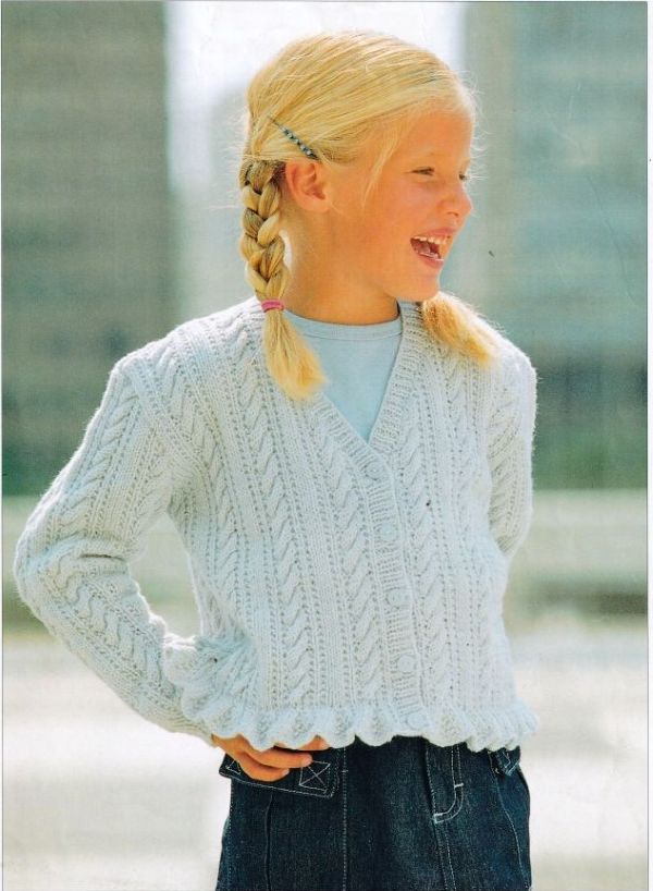 Girl’s cardigan 22-32″ 56-81 cms 1-12 years DK knitting pattern digital download.