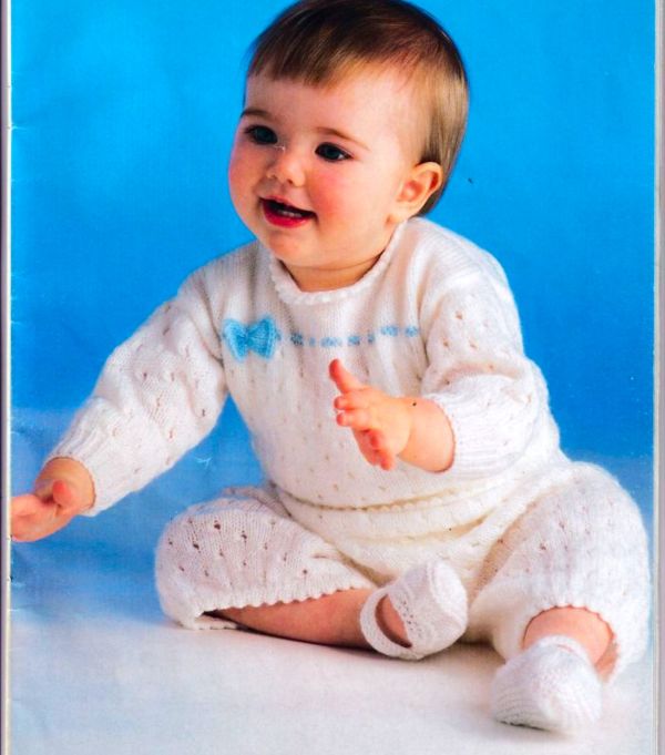 Baby’s set of lace sweater, shorts & shoes 12-20″ 31-51 cms 4 ply knitting pattern digital download.