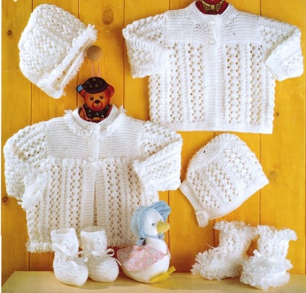 Baby set of lace matinee jacket, bonnet & bootees 12-20″ 31-51 cms premature to 2 years knitting pattern digital download.